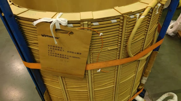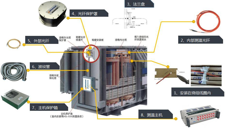 如图所示,油浸式变压器荧光光纤测温系统由内部光纤、法兰盘、外部光纤、测温主机组成,内部光纤根据设计需求布置于绕组线圈、铁芯、油面等部位,通过法兰盘上的贯通器与外部光纤连接,光信号通过光纤传导至测温主机解析出测点温度。