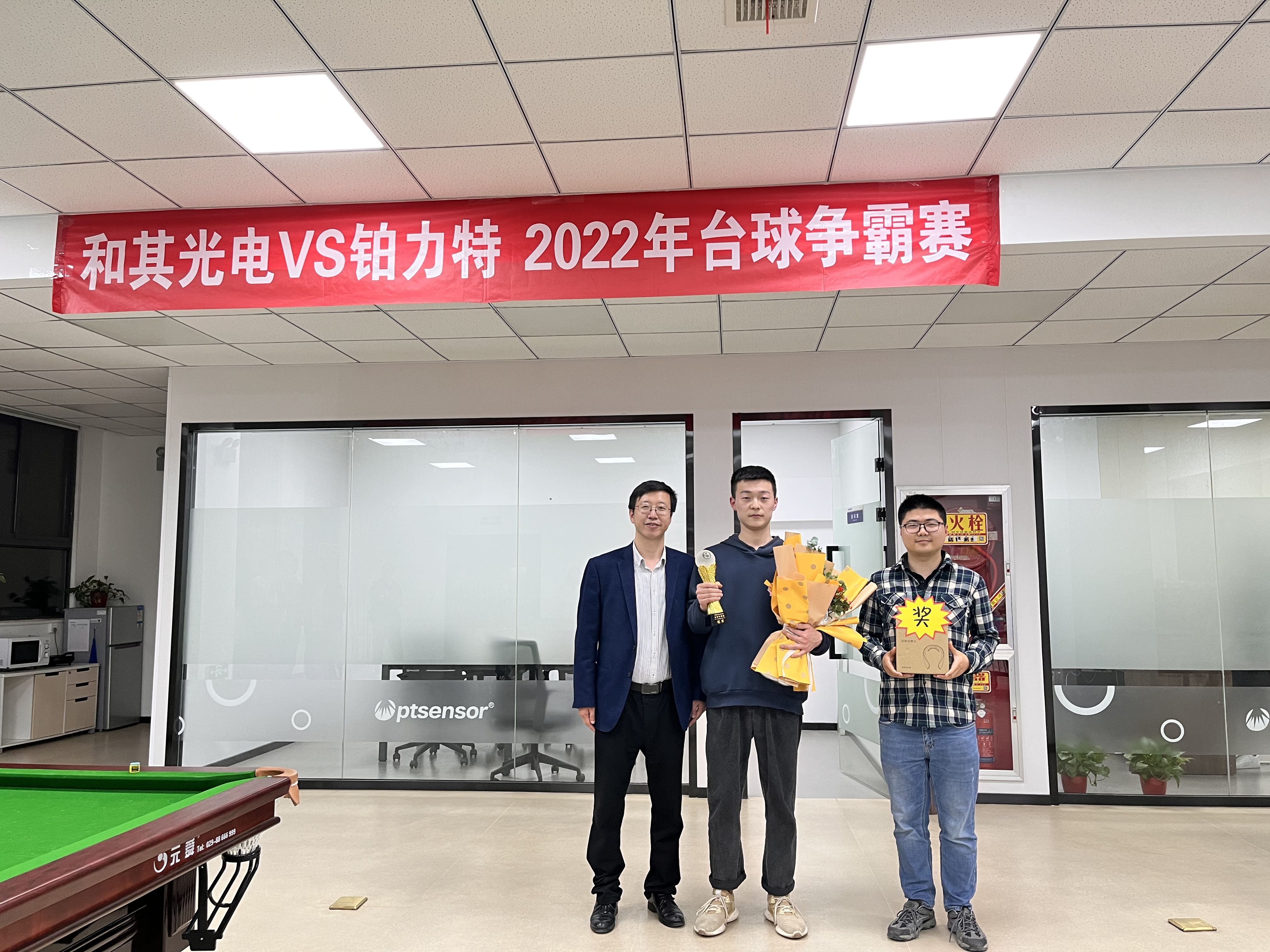 为进一步增强和其光电与铂力特两家公司的友好情谊,促进两家公司互动交流。2022年4月15日18:00,和其光电VS铂力特首次友谊赛——台球争霸赛正式开赛。 经过两个多小时的激烈角逐,铂力特李同学技压群雄,获得本次比赛冠军!!!