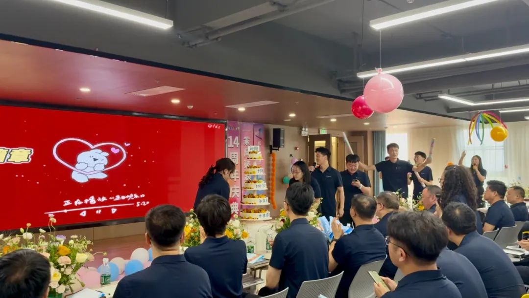 庆典的温馨时刻,当属生日仪式。工号尾号为020、011、008、001、014的五位员工代表受邀上台,共同切开象征圆满的生日蛋糕。这些看似普通的工号尾号不仅串联着公司2011年8月1日的创业原点,也丈量着这14年来公司的每一步成长。每一份分享,都承载着我们对过往的感恩,对当下的珍惜,以及对未来的无限憧憬。