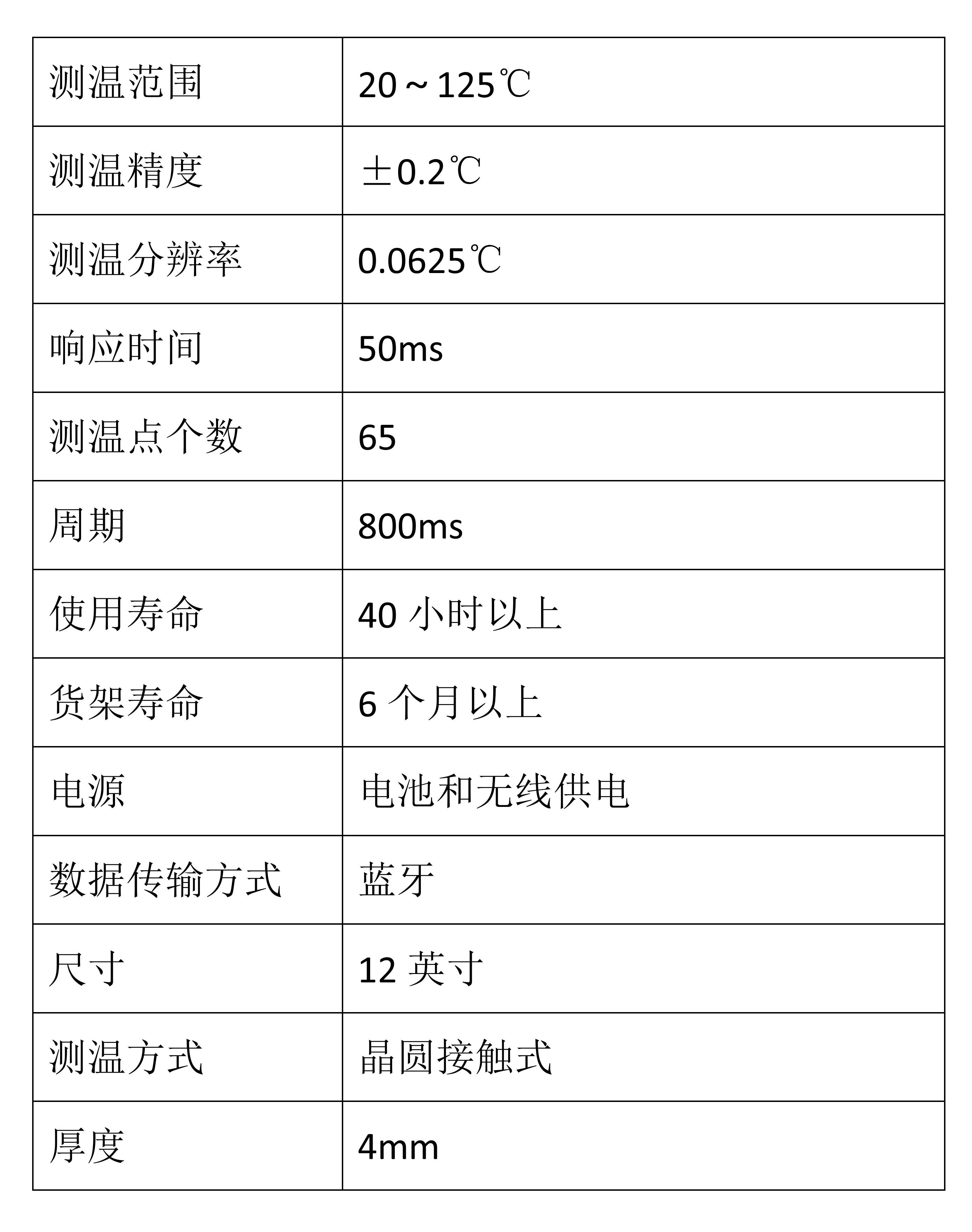 IC Wafer晶圆采用无线、薄型设计,可以在所有光刻工艺设备中使用,可为关键生产工艺提供高精度的静态和动态温度测量。使用65个传感器来帮助光刻 工程师表征热均匀性并分析热循环的各个部分,包括传输、加热、冷却和稳定状态。内置的天线及无线充电电池在放入配套工作站后自动传输数据并充电,在上位机通过IC thermometer软件进行参数配置。